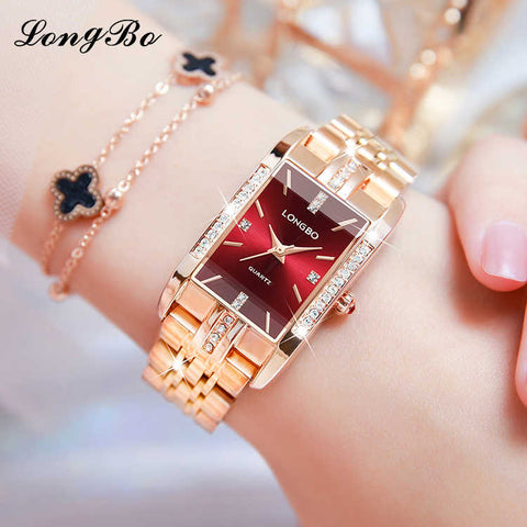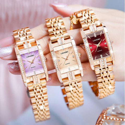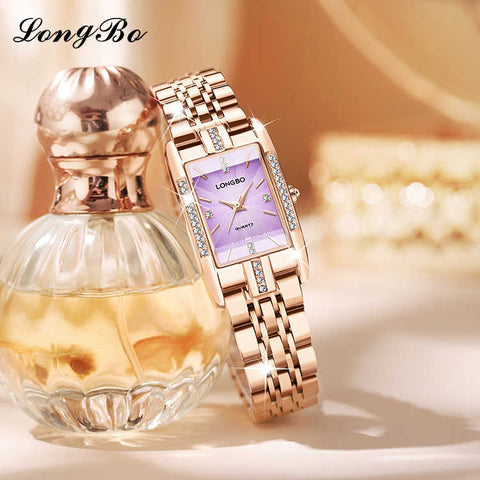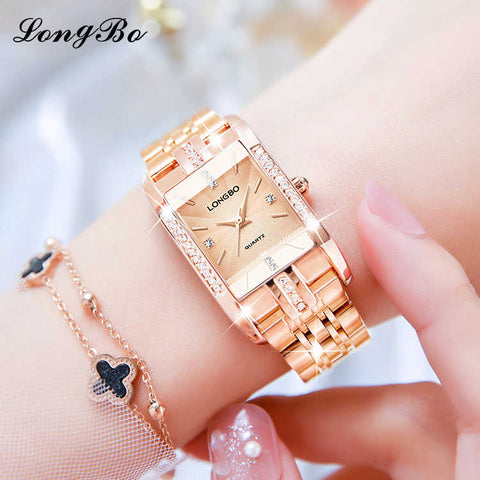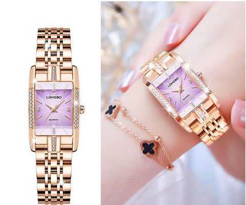 Rose gold strap, rectangular rhinestone-set three-dimensional embossed dial, always shining your beauty, light luxury time with you.